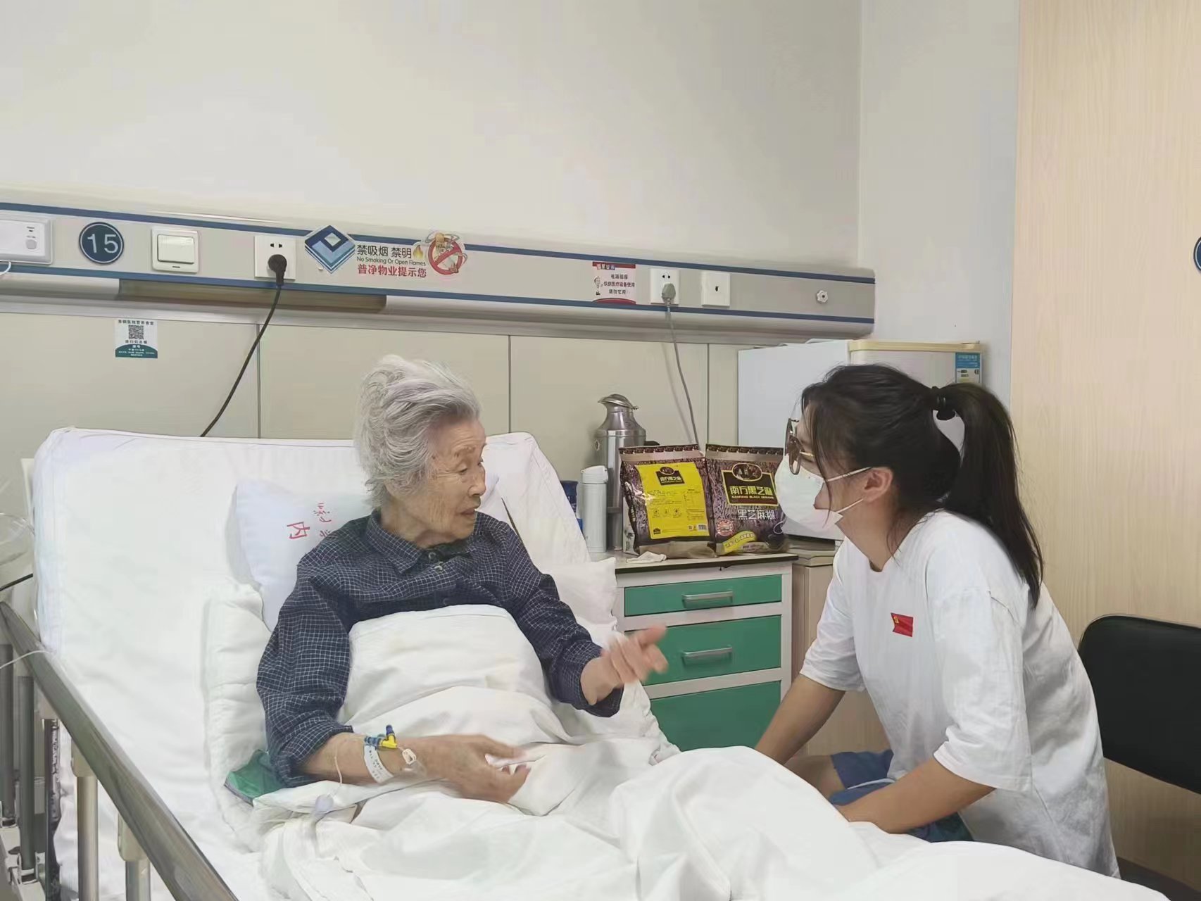 材料本科党支部成员在首钢医院内科临床部护士长引领下,慰问了在革命时期有着红色经历的住院老人。同学们热情问候老人,祝福老人安心治疗、争取早日康复。慰问中,同学们还聆听了老人们讲述的亲身经历,让大家感受到我们祖国从站起来、富起来到强起来的巨大变化,深切体会到幸福生活的来之不易,更加坚定了理想信念。老人们也希望同学们不负时代、不负韶华,努力学习、全面发展,做社会主义的建设者和接班人。