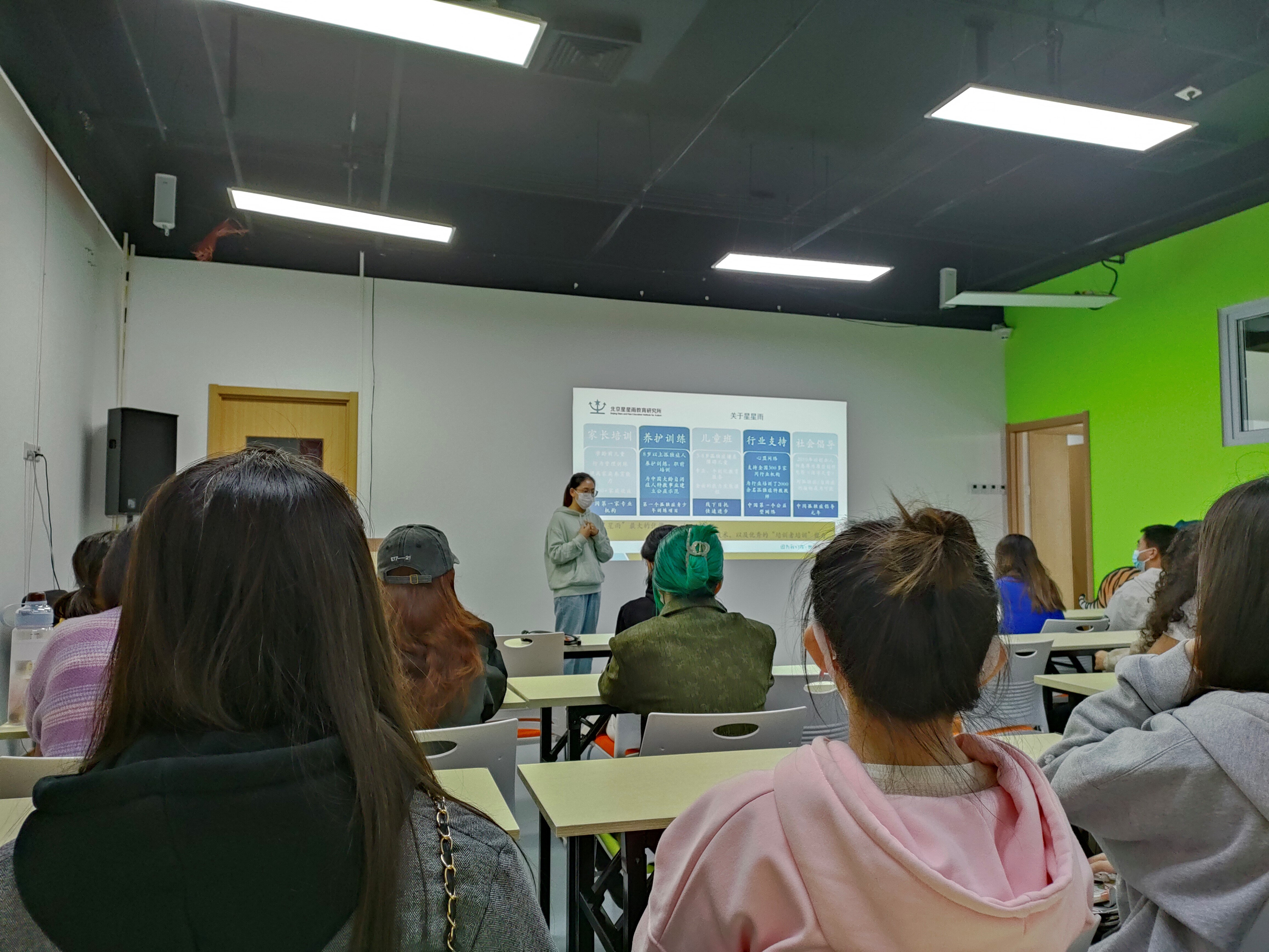在研究所老师的介绍下,志愿者们了解到应如何和孩子进行良好的沟通和交往,通过了解自闭症患者的相关故事,更加理解和体谅“星星的孩子”成长的不易。