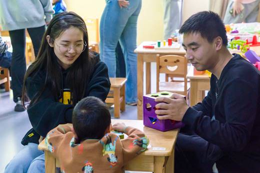 学习结束后,在专业老师的介绍和带领之下,志愿者们来到各自负责的班级。温馨的教室里,志愿者们与小朋友们一起互动,玩玩具、拼积木孩子们稚嫩的面庞上无不洋溢着欢快的笑容。为了提高孩子们的动手能力和自理能力,志愿者们细心、耐心地帮助孩子们顺利地完成了走直线以及事物区分等益智活动。在活动中孩子们感受到了来自志愿者们的关爱,也渐渐与志愿者们建立起信任与友谊。