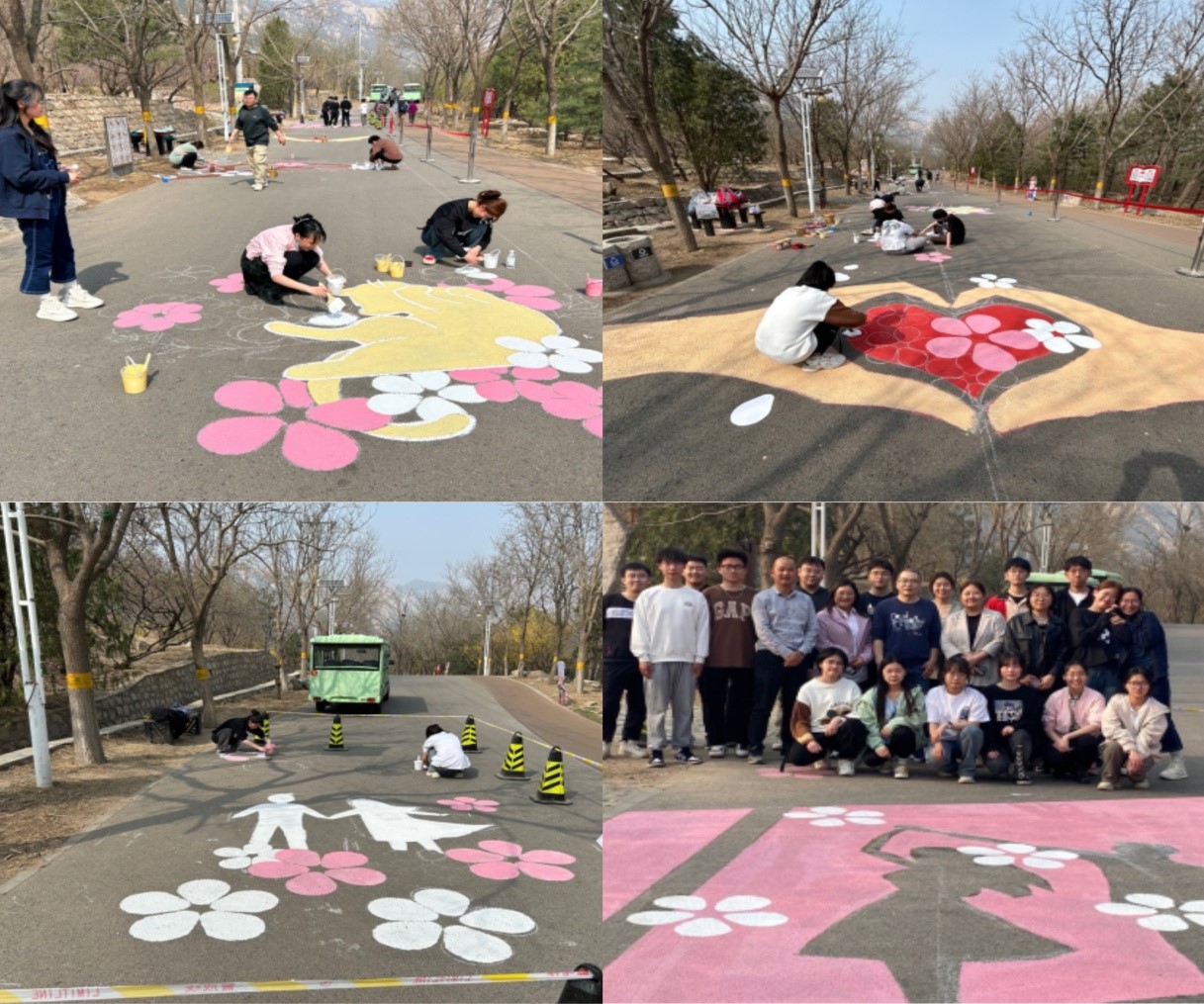 工设教工党支部书记边鹏,工设本科员工党支部书记尹建伟,凤凰岭景区党支部书记兼总经理谭佳,凤凰岭景区党支部支委兼副总经理沈贺玲、陈泰然等现场指导了活动的开展。机械与材料工程公司党委书记王文革也到现场观看了同学们的地面彩绘活动。