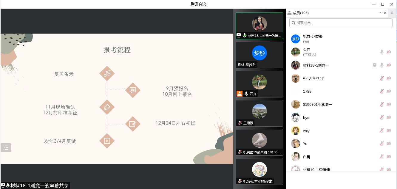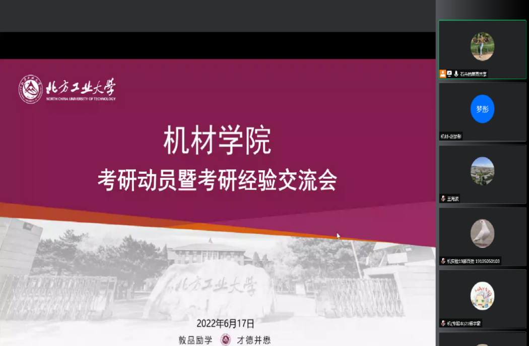 2022届考研代表围绕备考经验、院校选择和心态调整进行了分享。保研到北京科技大学的刘竞一提醒大家在考研过程中,不仅要尽早做好考研的准备,保持良好的心态,还要了解自己的兴趣爱好,正确选择专业。考上北京航空航天大学的王玉告诉同学们考研要有信心,要耐得住寂寞,要讲究复习方法,只要肯下工夫就一定可以成功。一志愿考上本校的安畅全面细致分享了考研路上的历程和经验,鼓励大家养成良好的学习习惯,根据自身情况理性地选择目标院校。考上北京工业大学的杨光勉励大家放弃舒适的生活方式,抓住机会,用努力和奋斗实现自己的价值。调剂到宁夏大学的隗丹琳从自身经验出发提醒大家公司的选择很重要,可以根据其他“上岸人”的经验,调整适合自己的专业和公司。