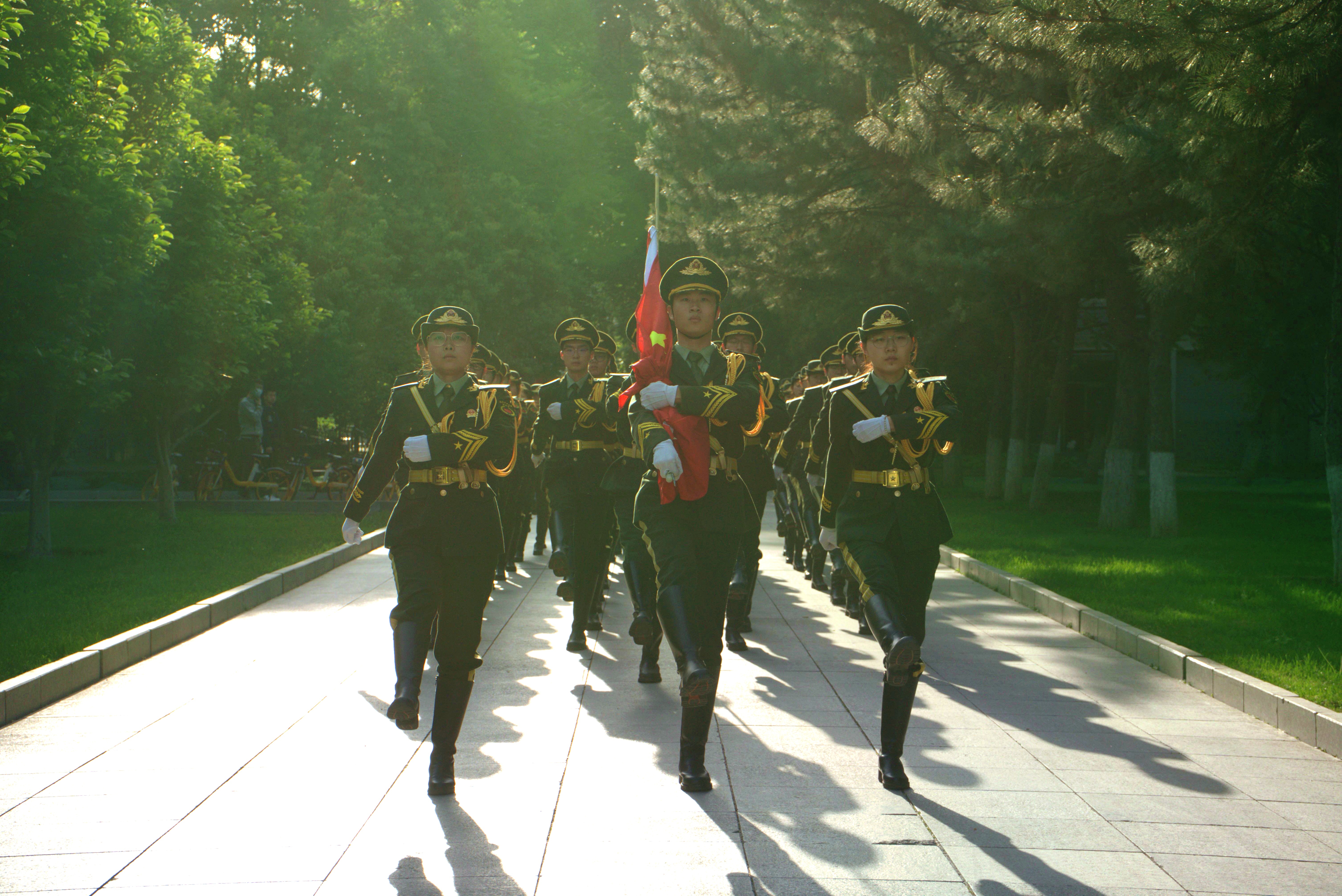 国旗班迈着整齐划一、铿锵有力的步伐,护送着五星红旗正步来,全体师生集体行注目礼。随着雄壮的国歌奏响,全体师生齐唱国歌,注目五星红旗冉冉升起、在熠熠晨光中迎风飘扬。