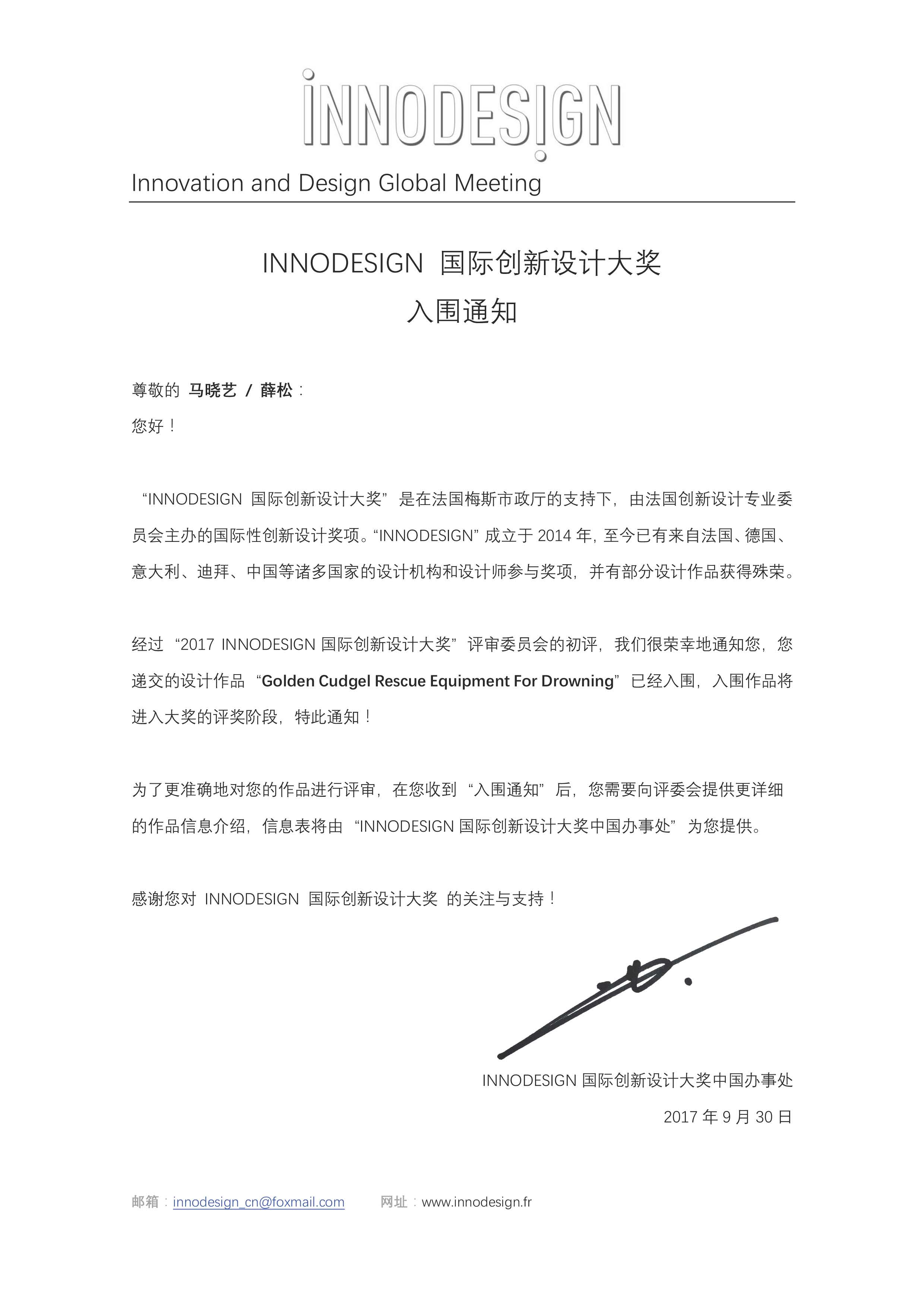 马晓艺和薛松同学在读研期间多次参加各类高水平设计竞赛,成果显著,为参赛并入围“2017 INNODESIGN国际创新设计大奖”奠定良好基础。公司员工的参赛入围,体现了公司员工的良好专业素养,也参与了中法设计交流。