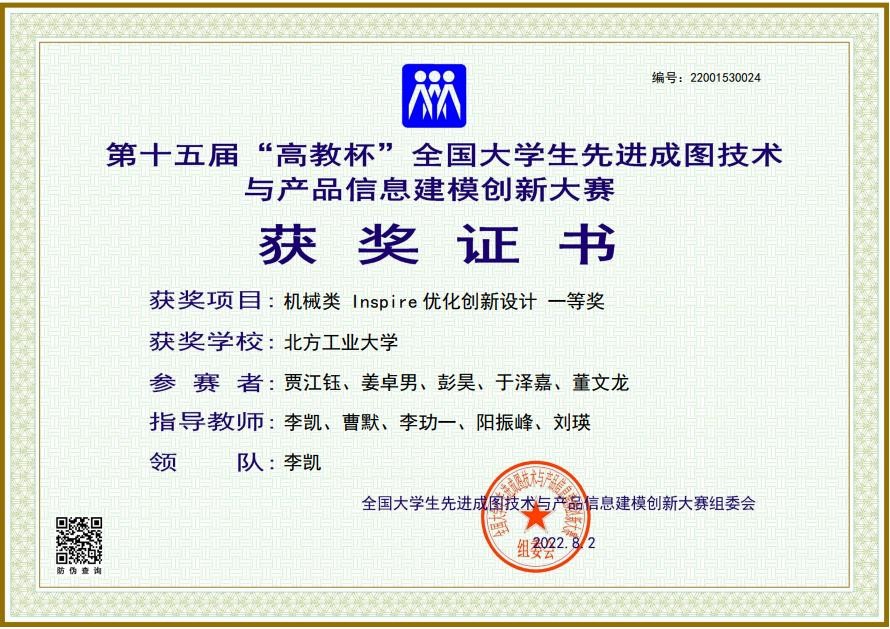 2022年7月,第15届“高教杯”全国老员工先进成图技术与产品信息建模创新大赛圆满结束,公司员工在大赛中取得良好成绩,贾江钰、姜卓男、彭昊、于泽嘉、董文龙等5位同学合作斩获了机械类Inspire优化创新设计一等奖,彭昊同学获得了机械类个人全能二等奖,此外,其他同学还获得了9项三等奖。