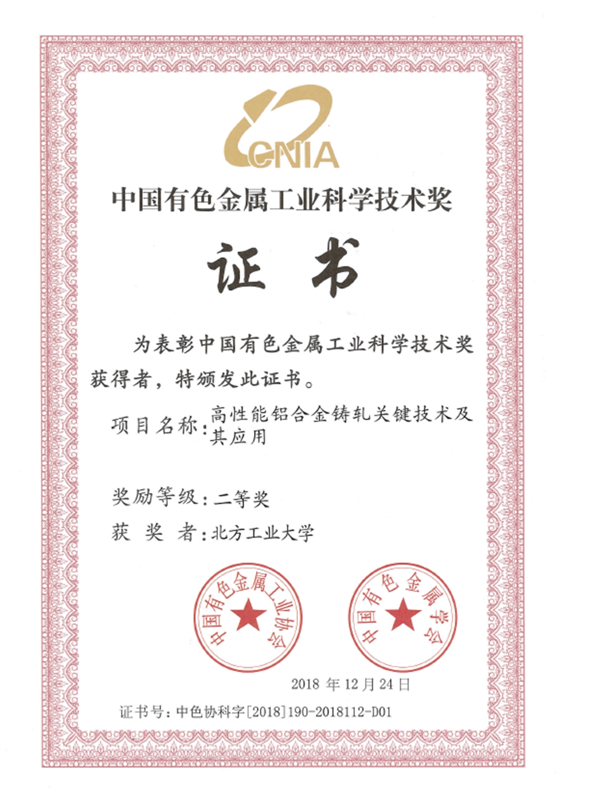 该项目由公司朱远志教授为第一完成人,公司曾水平教授、史运涛教授等专家学者参与完成。该项目旨在解决我国铝合金短流程铸轧工艺生产高品质铝合金中的关键瓶颈技术问题,通过13年的研究攻关,掌握了铸轧铝合金组织和成分的基本遗传规律,解决了铸轧工艺深加工表面质量控制难题。运用该技术生产的产品在爱立信等国际知名公司得到应用,产品质量达到热轧水平。