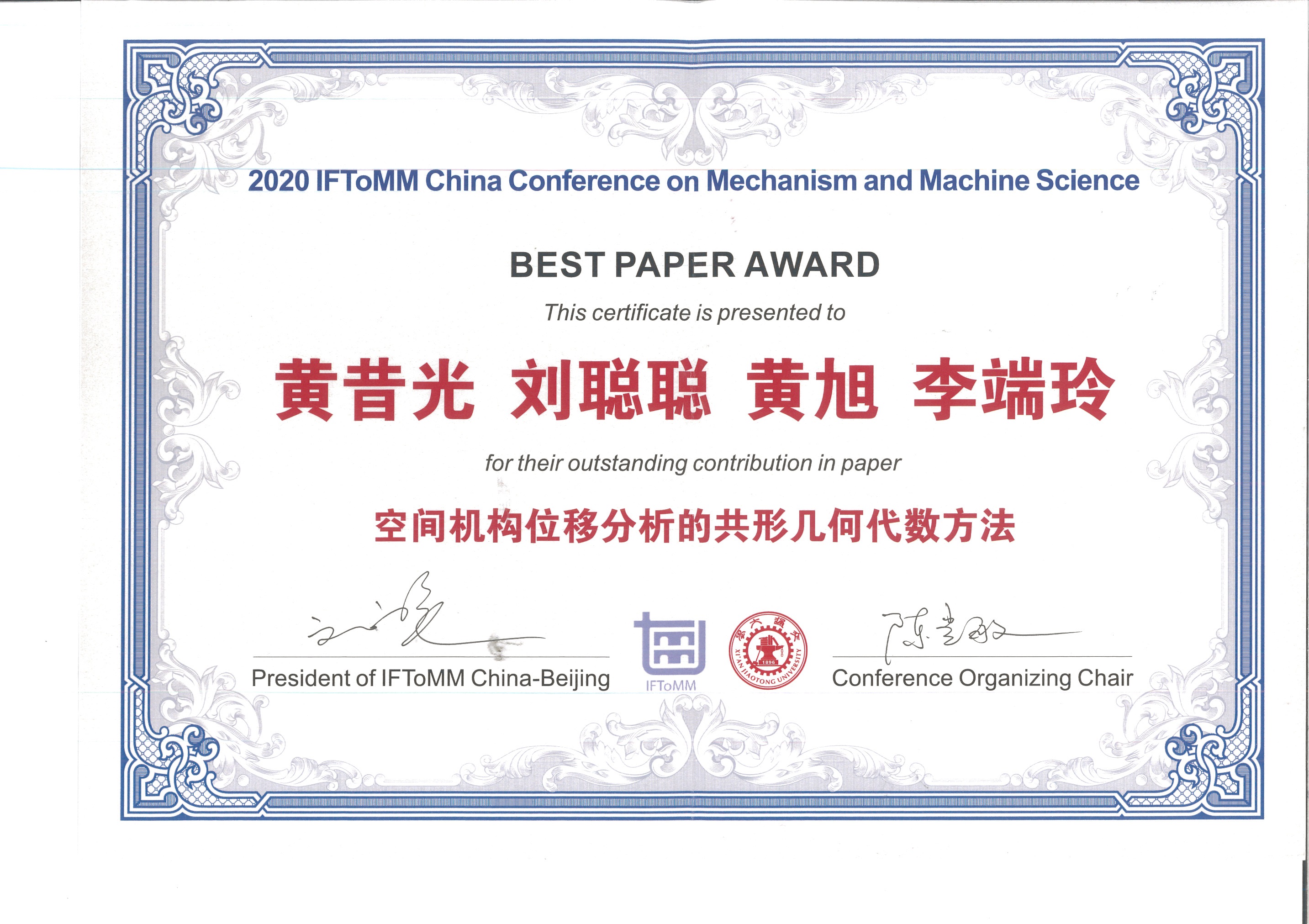 9月25日-27日,第22届中国机构与机器科学会议(CCMMS 2020)在古都西安召开。十大正规买足球网站教师黄昔光作为第一作者与通讯作者的论文《空间机构位移分析的共形几何代数方法》获得大会颁发的最佳论文奖(Best Paper Award)。