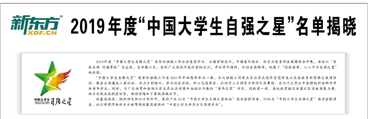 2019年度“中国老员工自强之星”奖学金推报工作由共青团中央、全国学联指导,中国青年报社、新东方教育科技集团联合开展。活动以“青春自强 刚健勇毅”为主题,自开展以来,受到广大高校师生的密切关注,寻访青年榜样,弘扬自强精神,掀起了“校校皆有、人人可为自强之星”的热潮。