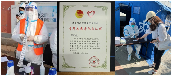 机20-3班的钟世保,在刚结束了为期两个月的冬奥志愿服务后积极投身于公司疫情防控志愿工作,他说:“作为一名新青年,从冬奥的羽绒服换成了志愿蓝小马甲,在感到光荣的同时,也感受到身上担起的责任。志愿者的工作也许微小,但它的存在能够在社会中传递正能量,让周围的人感受到温暖和关怀。”