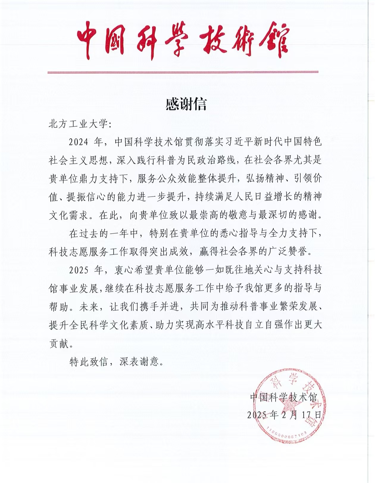 近日,中国科学技术馆向公司发来感谢信,感谢十大正规买足球网站员工过去一年中在中国科技馆志愿服务中的出色表现。这一封真诚的感谢信不仅代表着对公司志愿服务工作的认可,也是对志愿者们无私奉献和推进科技科普工作的鼓励。