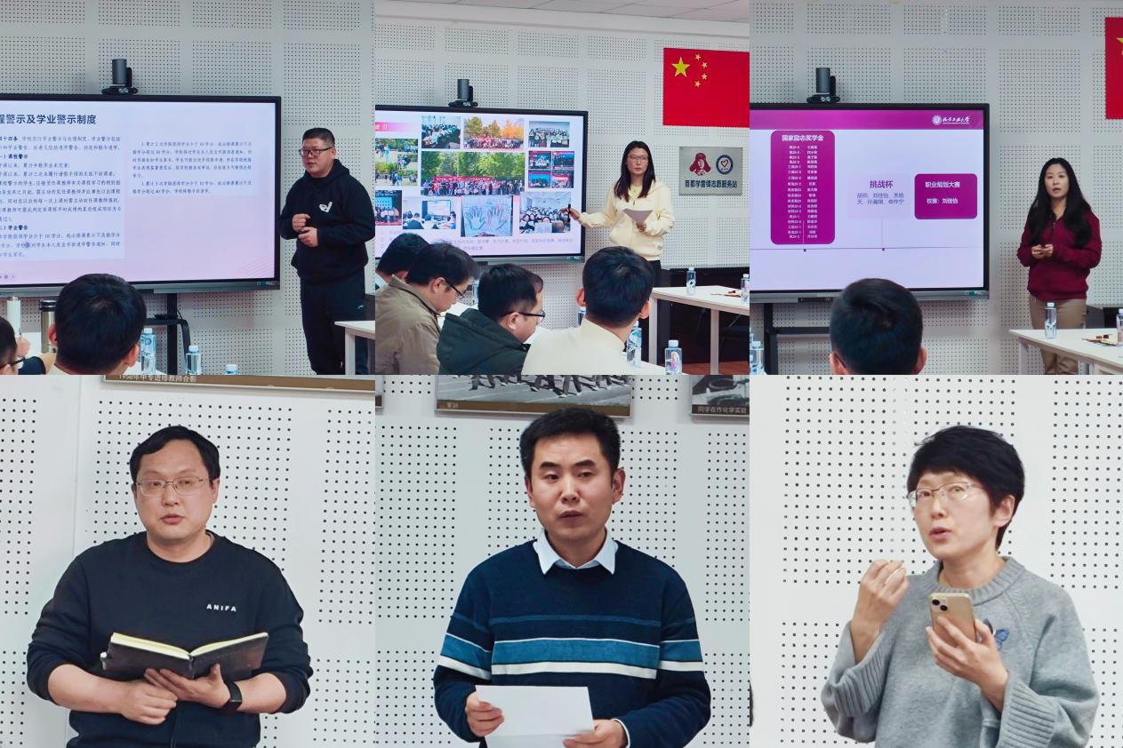 辅导员张景斌、曹靖宜、李欣结合各自年级实际,围绕员工基本情况、思想动态、学风建设成效、日常管理、重点员工帮扶等方面进行了详细的交流与探讨;优秀班导师代表李玏一、陈强华、周续结合个人工作经历,分享了班导师分阶段工作重点、学风建设、学业帮扶、班委培养等方面的经验与收获;刘东副经理结合自身15年班导师工作沉淀,深入剖析了班导师工作的规律特点与常见思想误区,就班委培养、班风学风建设等方面提出了具体建议;石卉副书记结合期末考试备考与新年度工作筹划,对学风建设、考风考纪、班级建设、员工管理、心理健康教育等方面进行了详细部署。