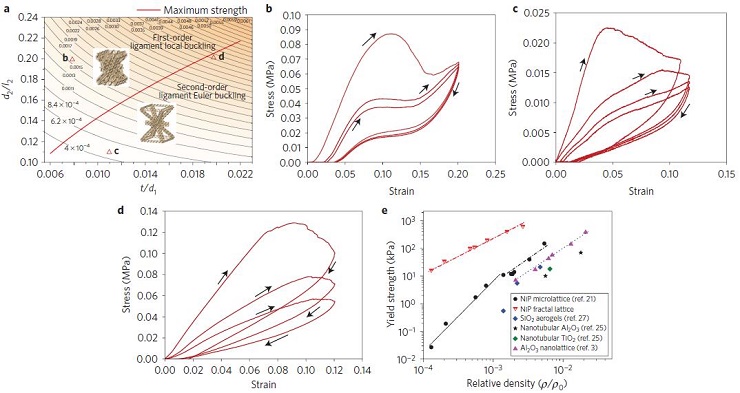 图3超材料可调控的压缩行为:(a)多尺度八棱结构单元的失效图随一阶二阶设计参数的变化关系,红色线表示在给定相对密度的前提下的最佳强度,每个等高线表示一个相对密度值,b-d位置标在图中,曲线如下;(b)在a图中强度最佳线上面的一种设计参数下的单轴压缩循环应力应变曲线;(c)在a图中强度最佳线下面的一种设计参数下的单轴压缩循环应力应变曲线;(d)在a图中强度最佳线附近的一种设计参数下的单轴压缩循环应力应变曲线;(e)多尺度超材料的强度与相对密度的关系曲线,还列出了其他低密度材料的相关数据
