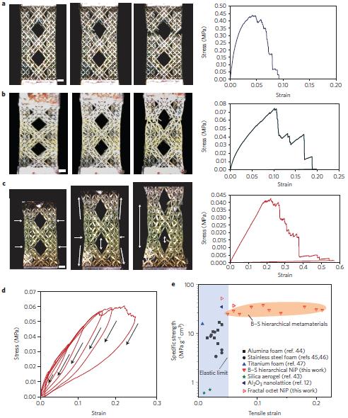 图4混合结构多尺度超材料的拉伸测试:(a)结构参数壁厚为700nm时的拉伸曲线以及实验过程的抓拍图,表现出低弹性,塑性行为和断裂行为都和传统的金属泡沫材料类似;(b)结构参数壁厚为150nm时的拉伸曲线以及实验过程的抓拍图,表现出过渡态的行为,延性很好,但是发生脆断;(c)结构参数壁厚为60nm时的拉伸曲线以及实验过程的抓拍图,拉伸应变可接近20%,表现出极高的拉伸延性;(d)结构参数壁厚为60nm时的循环拉伸应力应变曲线;(e)混合结构多尺度超材料的极限抗拉强度与拉伸应变的关系,文献中的低密度金属材料的数据也置于图中作为对比