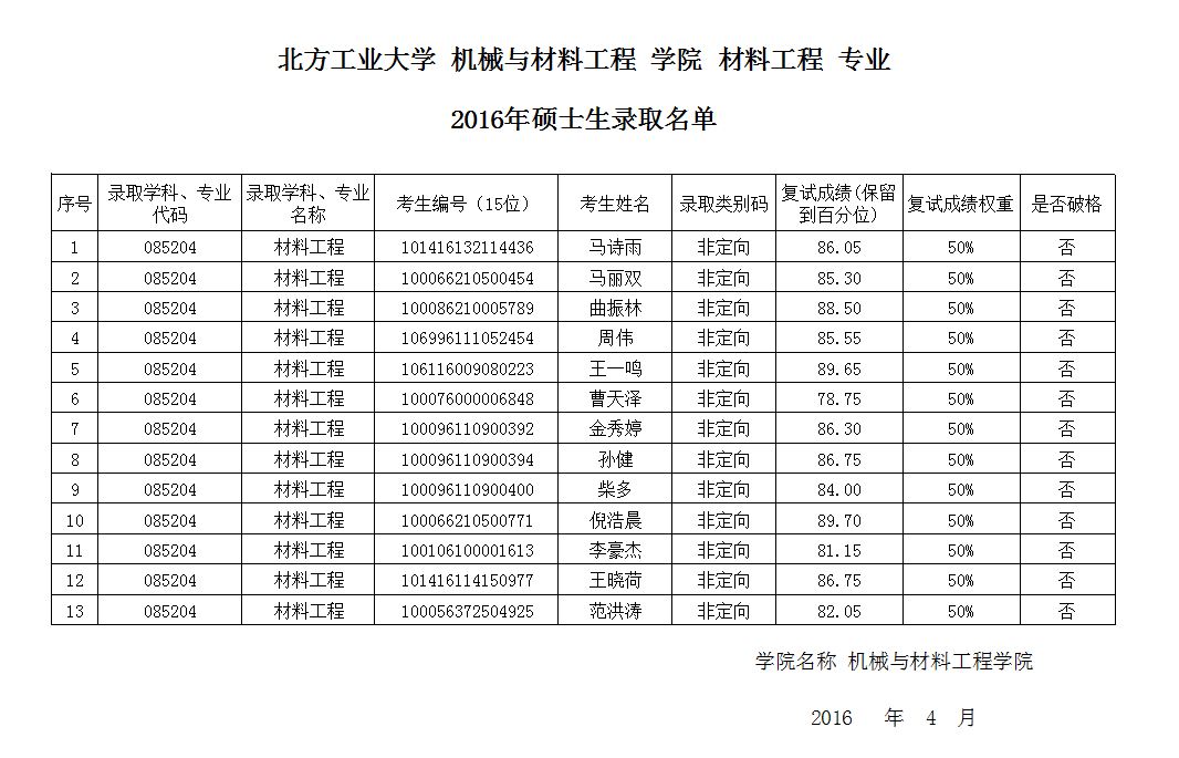 十大正规买足球网站材料工程专业2016年硕士生录取名单