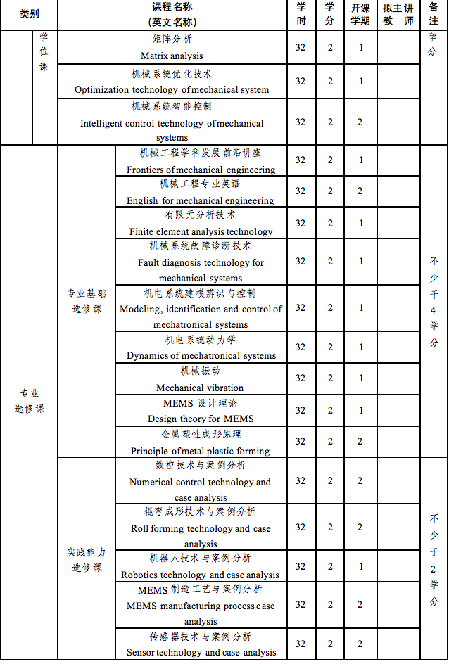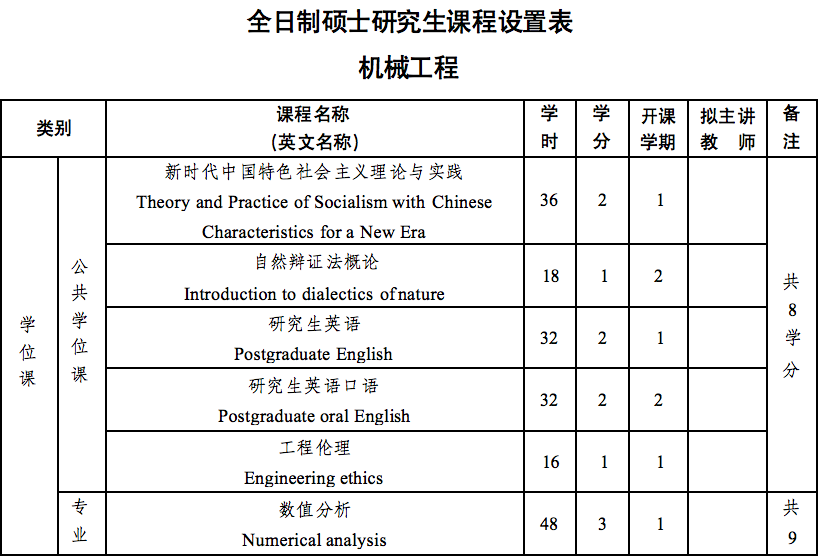 总学分不少于34学分,其中:公共学位课:8学分;专业学位课:9学分;专业选修课:不少于8学分;必修环节:9学分,其中文献检索及科技论文写作2学分,职业规划与创业教育1学分,专业实践6学分。