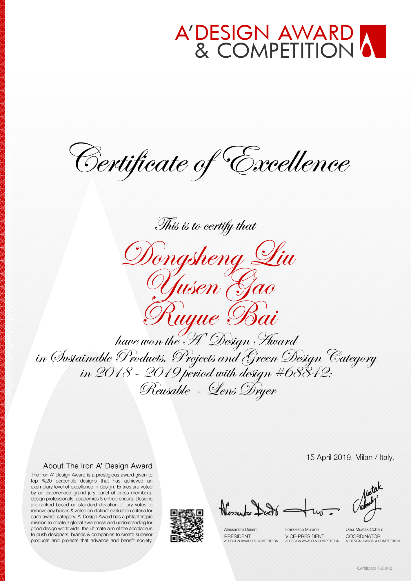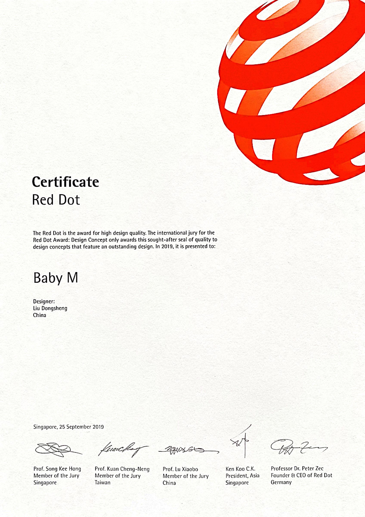 代表成果:专著《物尽其用-设计方法之通用设计》、红点奖《成长童车设计》、IF《Emergency Communication》、意大利A设计奖《镜头除湿盒》等。